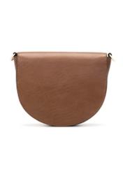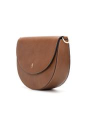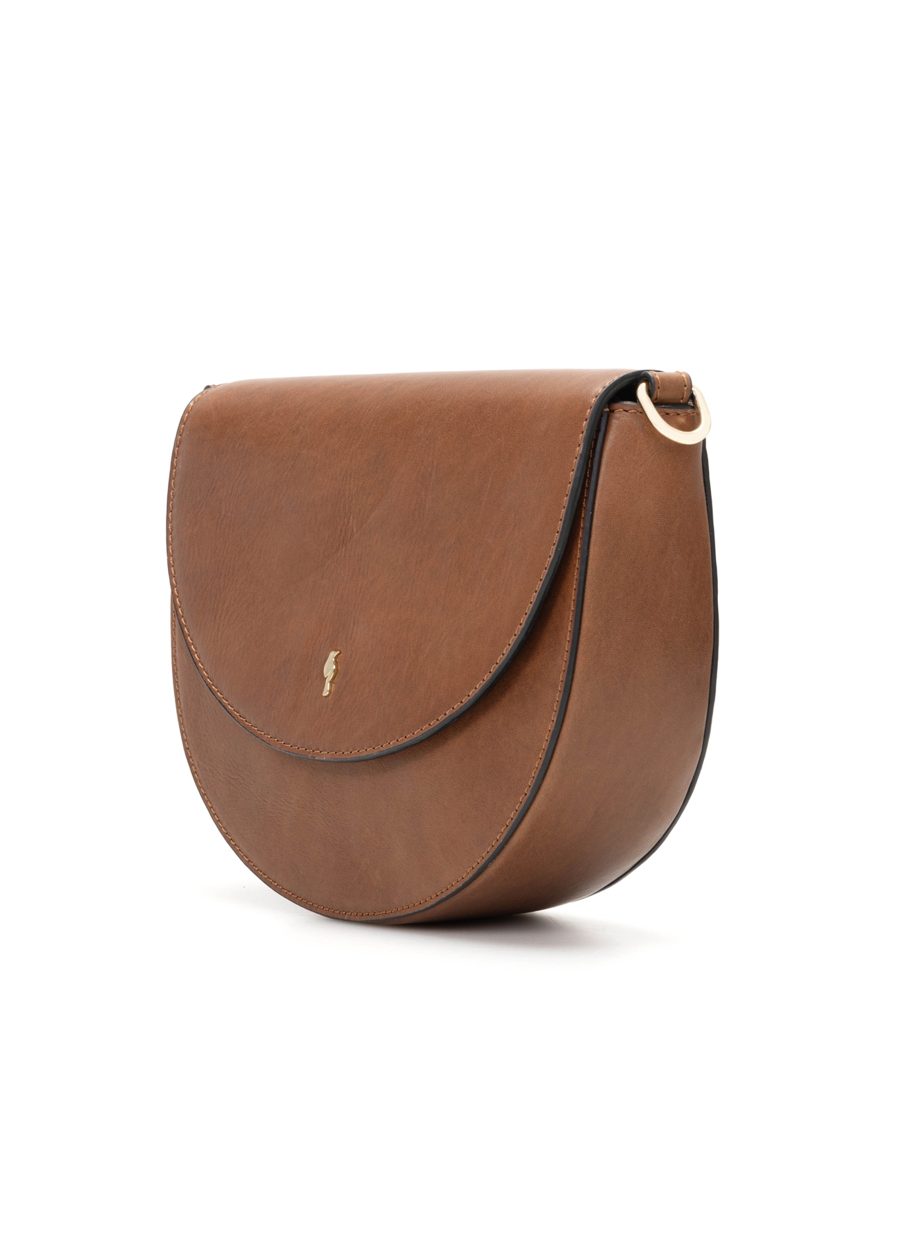 Torebka wykonana z naturalnej skóry w ciepłym odcieniu brązu, wyróżnia się półokrągłym kształtem oraz klasycznym zapięciem magnetycznym na klapę.