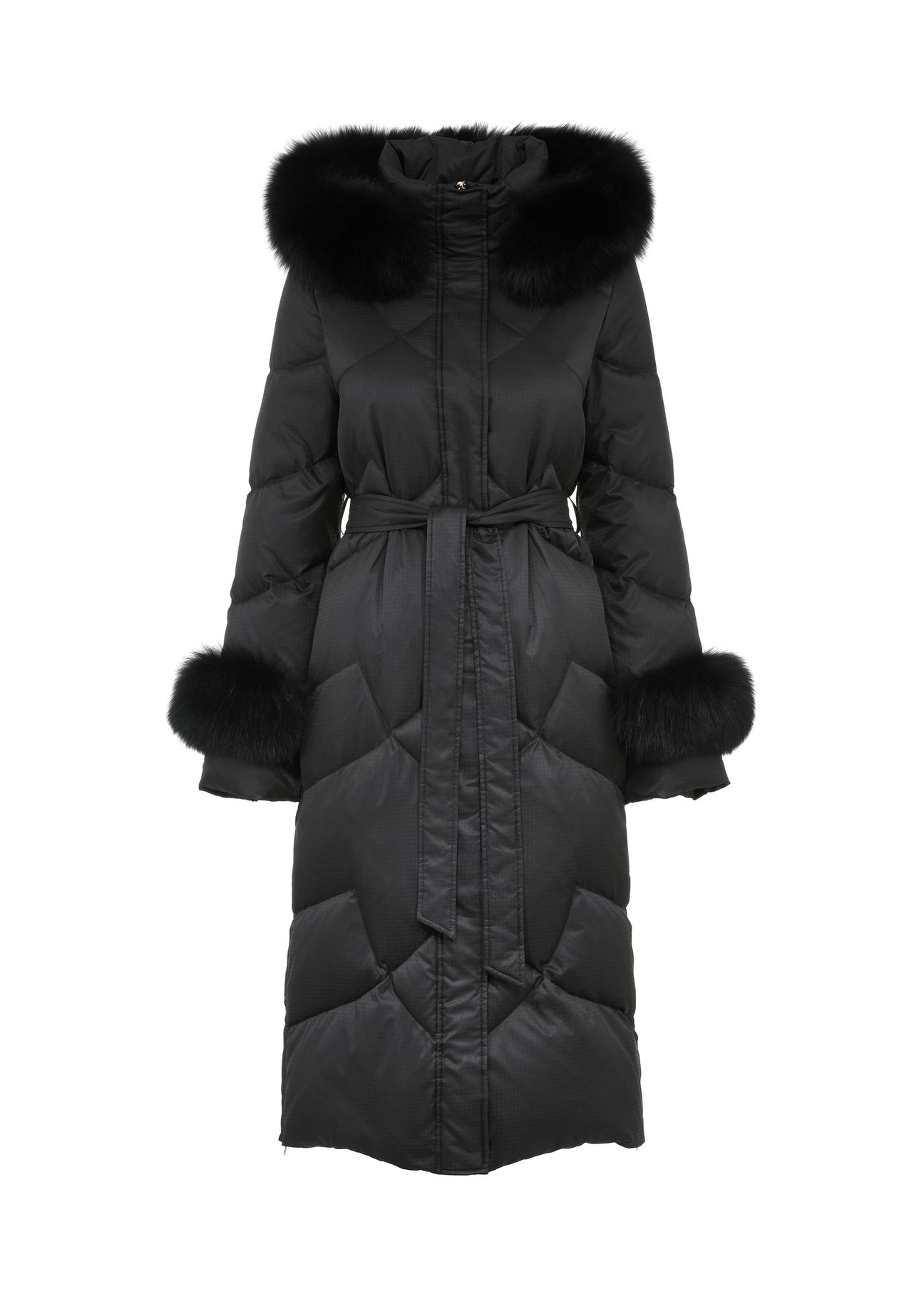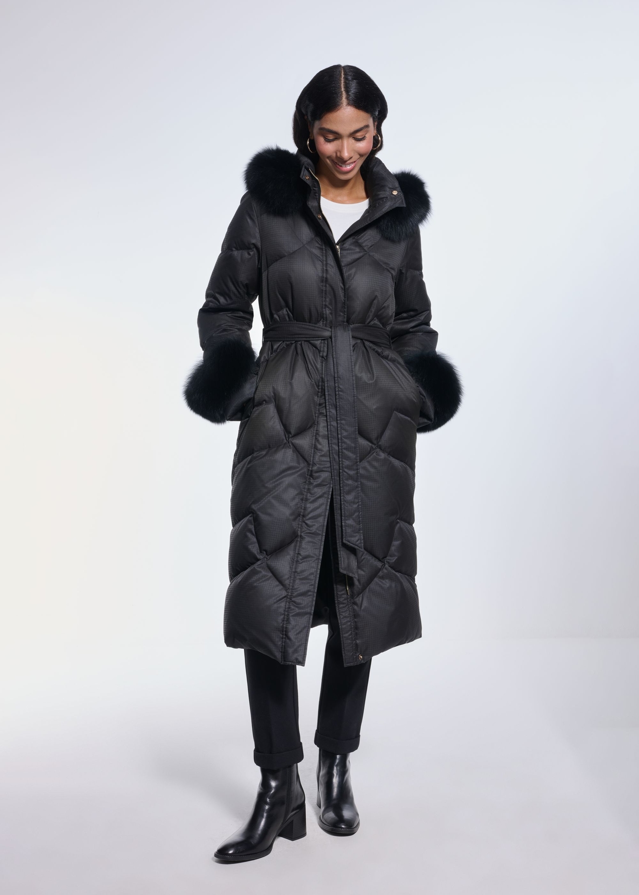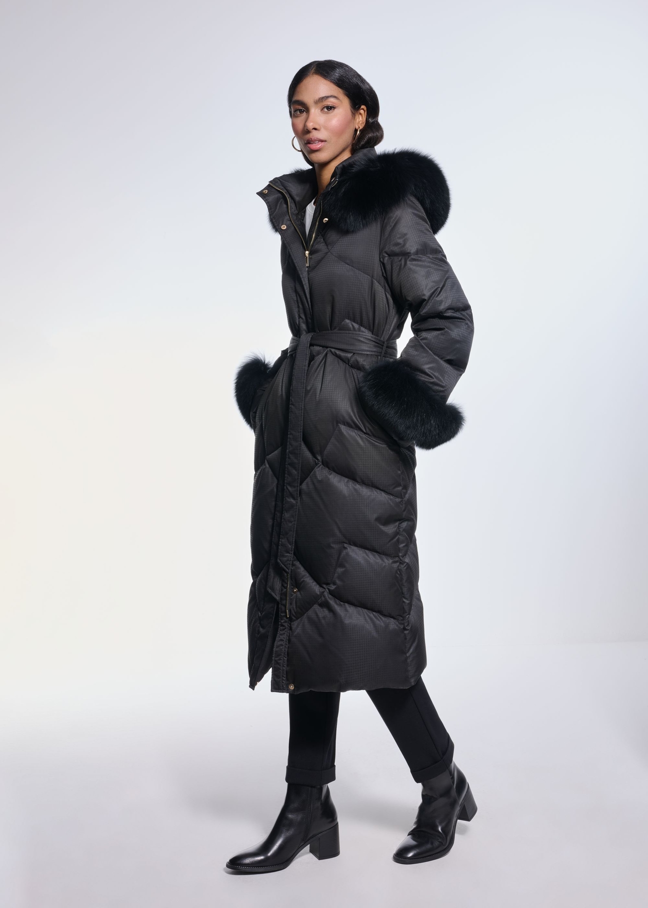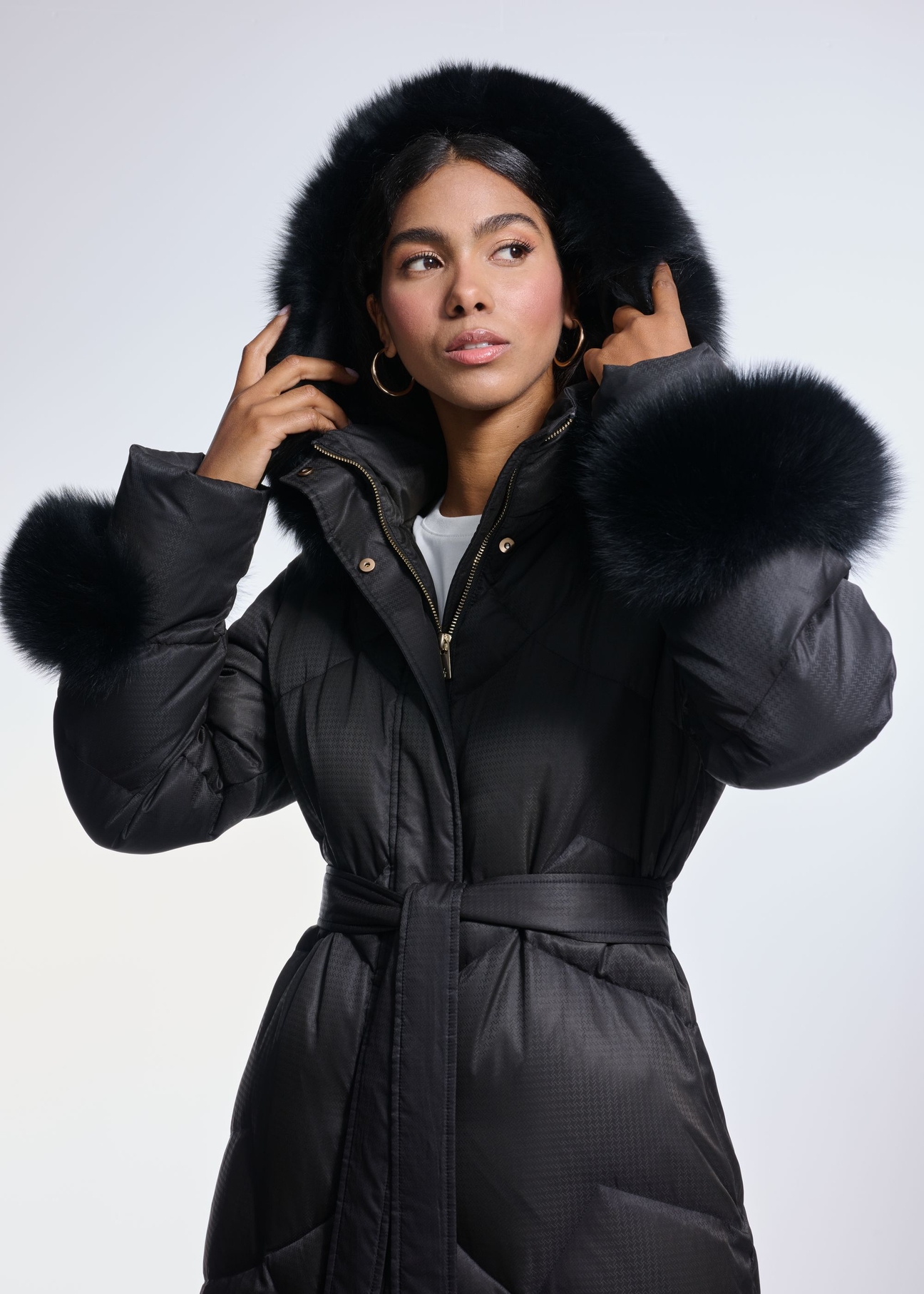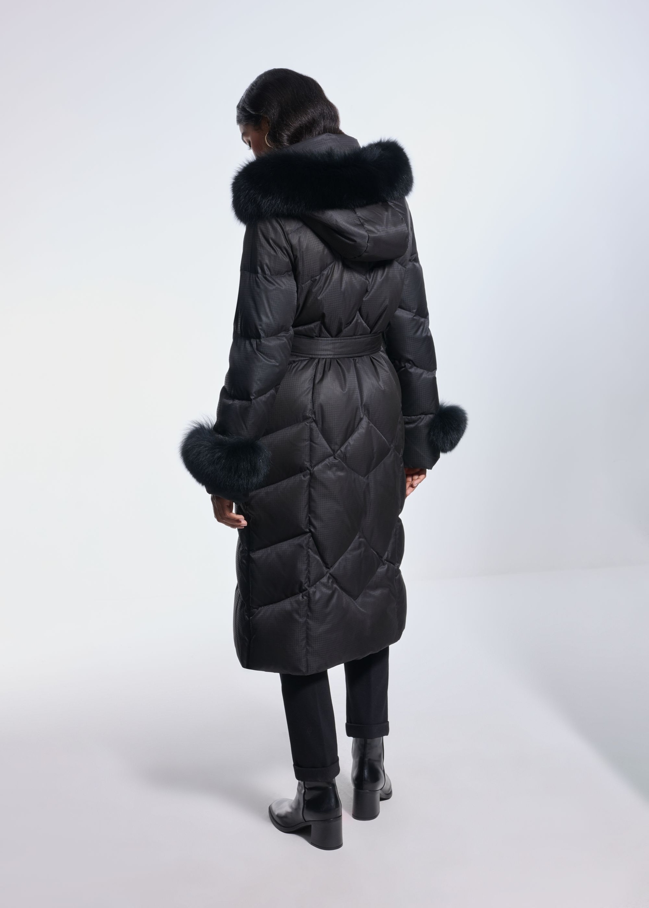 Куртка має рукави та капюшон, оздоблені знімним хутром з лисиці, що додає їй особливого, розкішного характеру. Можливість розширення нижнього краю дозволяє отримати ще більший комфорт.