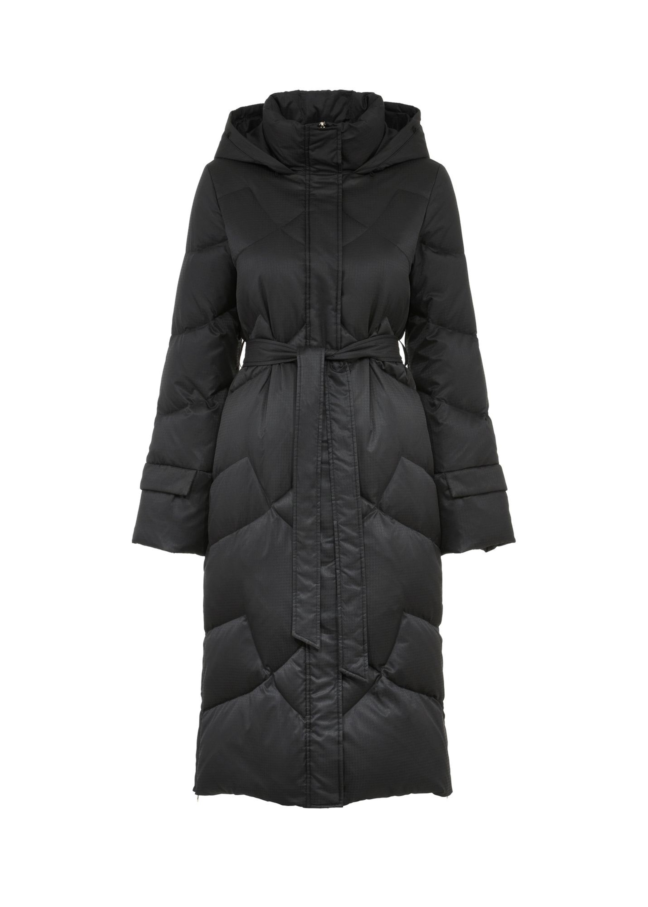 Ідеальна для зимових днів, куртка була утеплена натуральним пухом і пір’ям, забезпечуючи приємне тепло навіть у найхолодніші дні. Модель оснащена двонаправленою блискавкою та додатковою планкою з кнопками, що підвищує захист від холоду. Модна стьобана тканина та пояс на талії не лише додають їй характеру, а й забезпечують ідеальне прилягання до фігури.