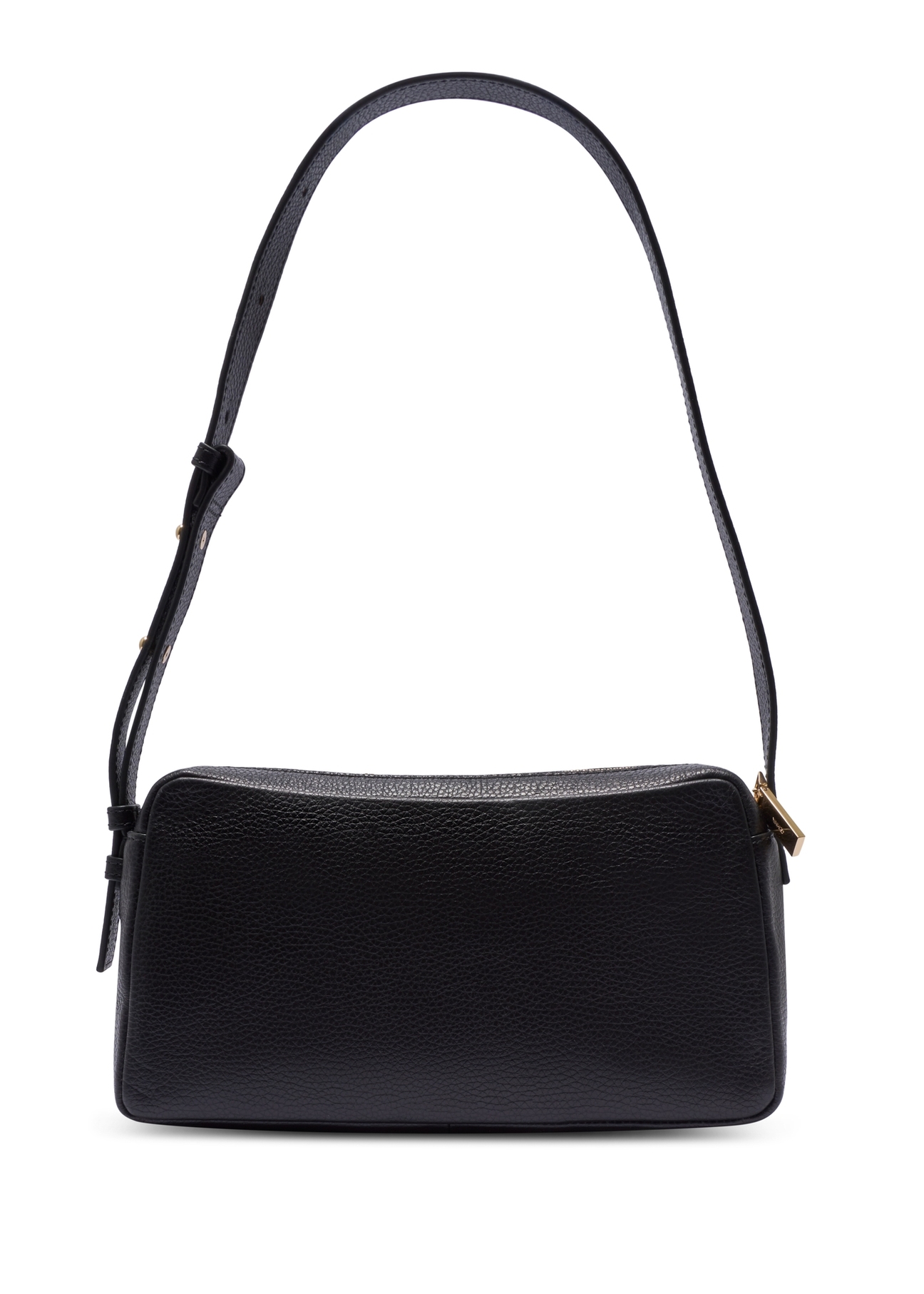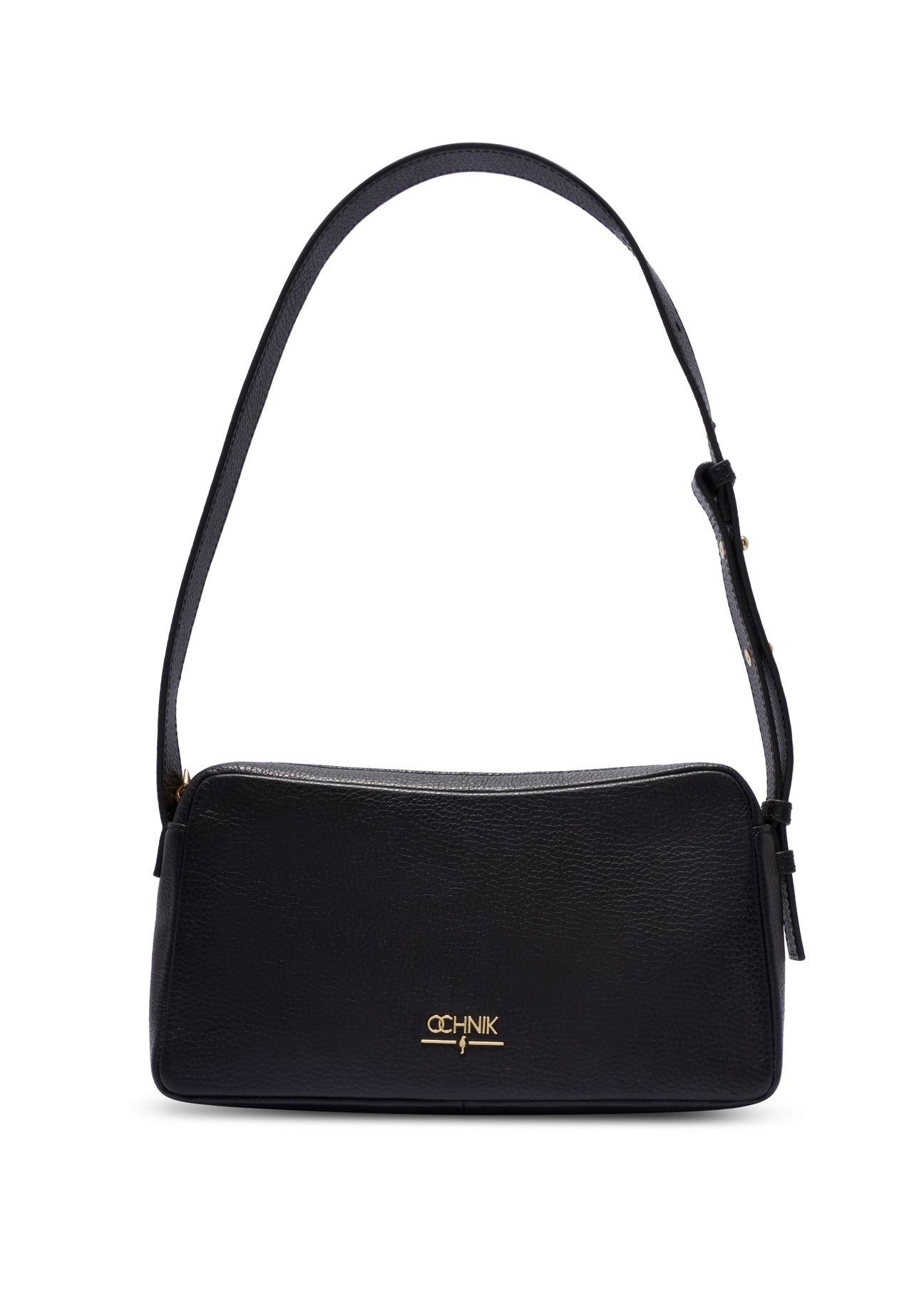 Złote elementy metalowe subtelnie kontrastują z czernią skóry, a logotyp na froncie stanowi elegancki detal podkreślający markowy charakter modelu.