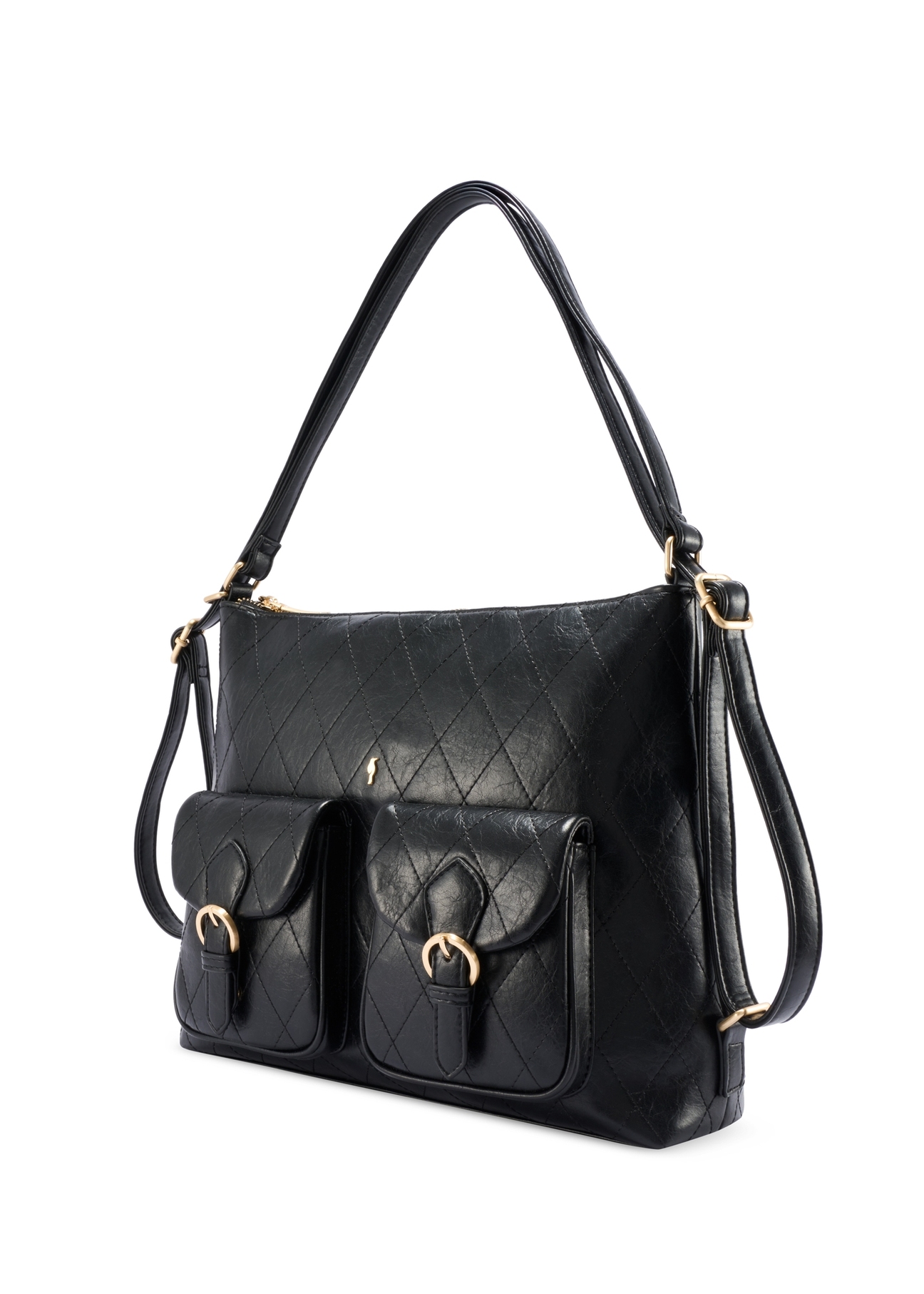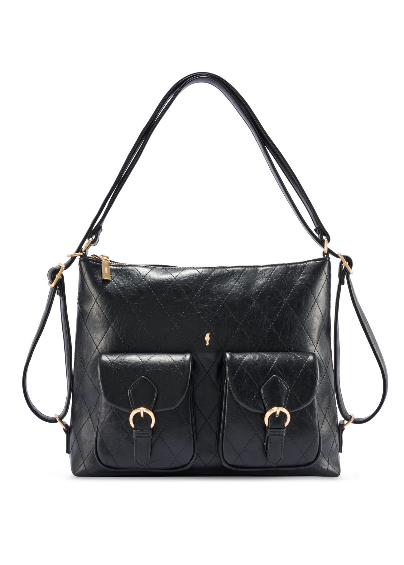 Jednokomorowe wnętrze z trzema kieszeniami, w tym jedną na suwak, pozwala na wygodne uporządkowanie niezbędnych drobiazgów. Dwie frontowe kieszenie z ozdobnymi klamrami i zapięciem magnetycznym nadają całości charakteru.
