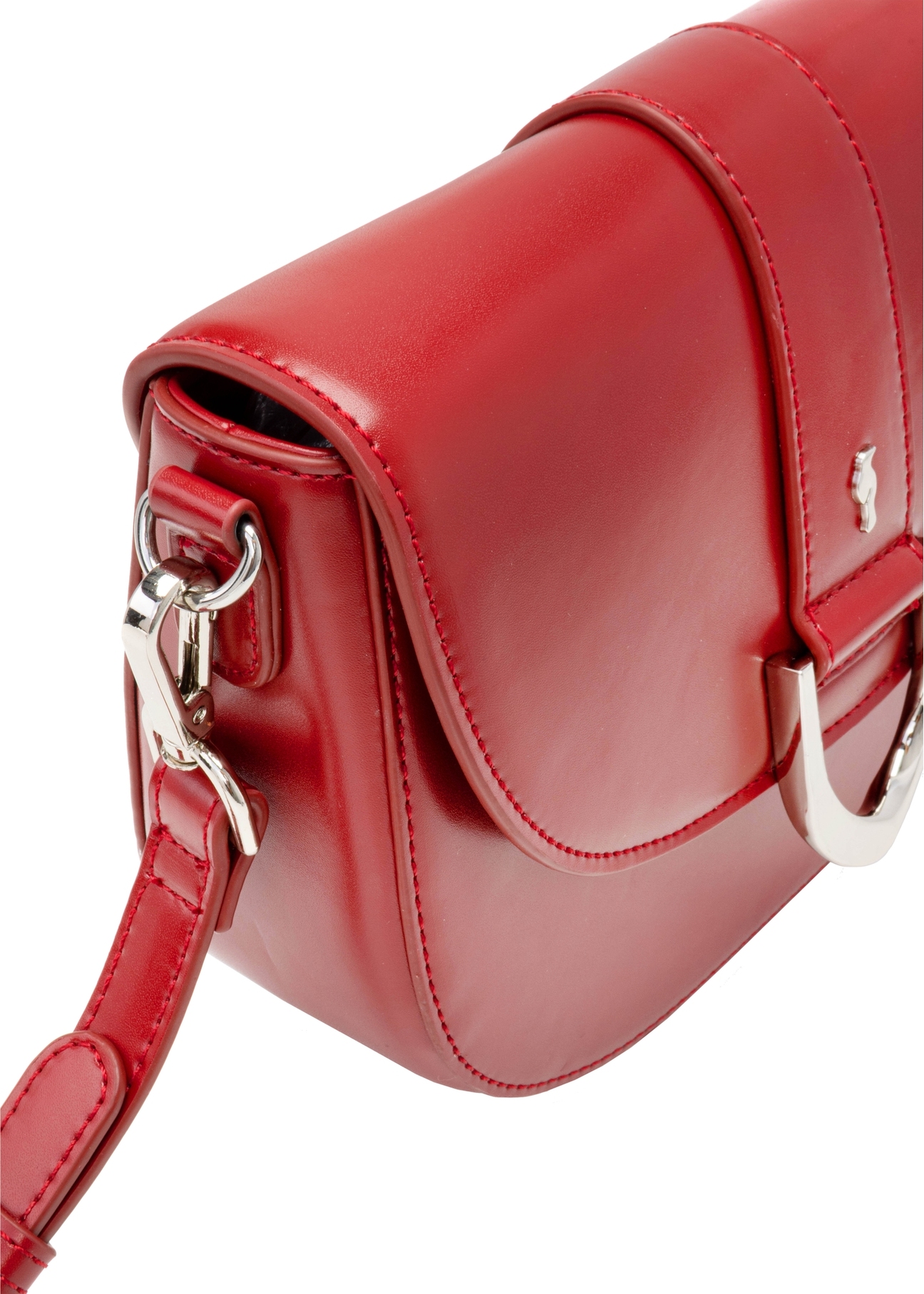 Czerwona torebka damska na ramię wykonana z wysokiej jakości imitacji skóry to idealne połączenie funkcjonalności i minimalistycznej elegancji. Jej kompaktowy rozmiar, złote detale i prosty krój sprawiają, że świetnie sprawdzi się zarówno na co dzień, jak i na bardziej formalne okazje.