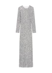 Elegancki charakter sukienki podkreśla długość maxi, a klasyczny design podkreślają długie, proste rękawy i okrągły dekolt.