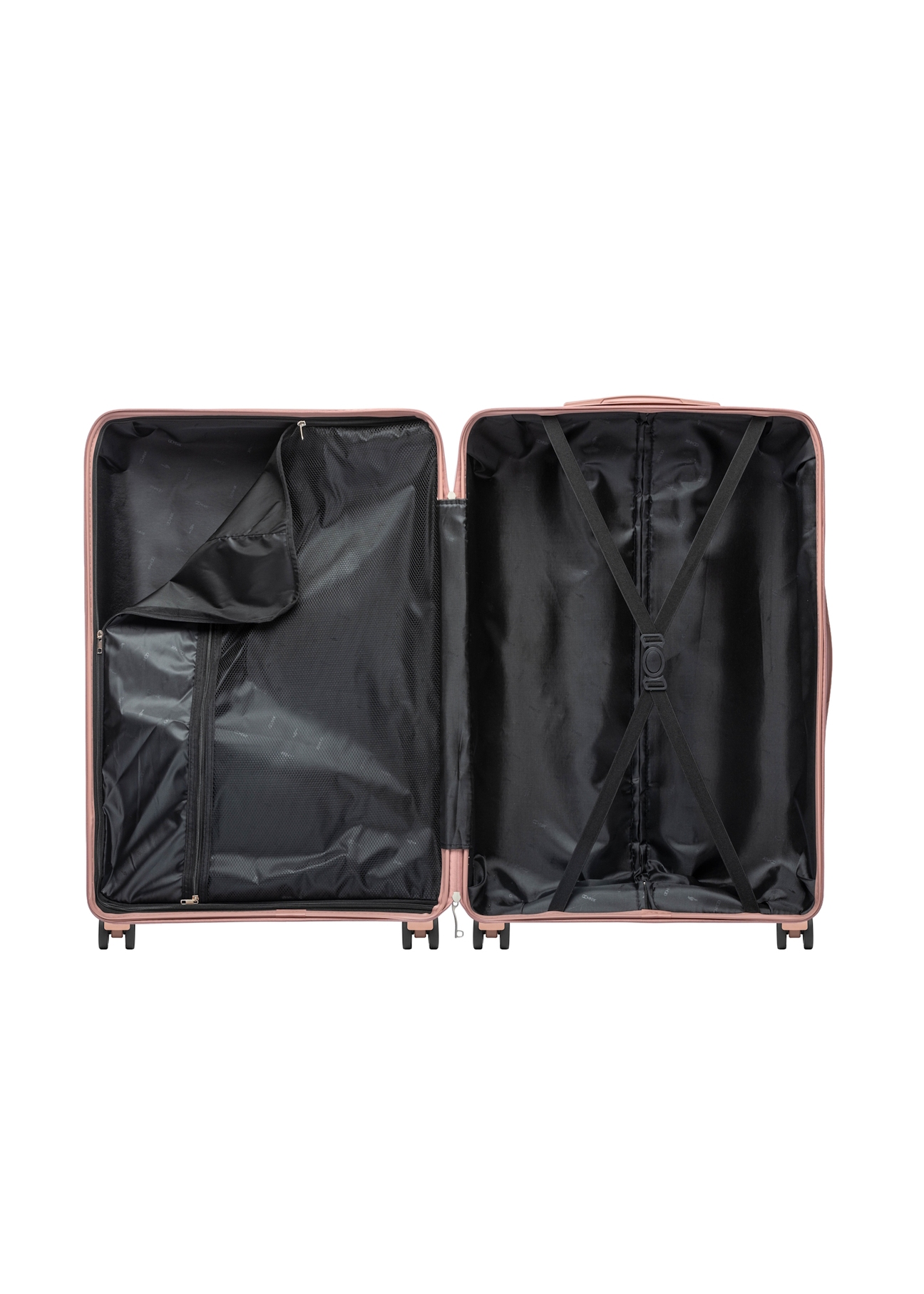 Велика валіза виготовлена з гнучкого та стійкого до подряпин PP (поліпропілену) матеріалу. Валіза має подвійні колеса з діапазоном обертання 360°. Завдяки двом гумовим ручкам і висувній ручці її можна зручно транспортувати. Всередині валіза розділена на два відділення. Одна частина закривається на тканинну блискавку і має практичну сітчасту кишеню, інша частина з еластичними ременями для фіксації багажу від переміщення. Валіза оснащена замком TSA.