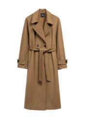 Dwurzędowe zapięcie na guziki i klasyczny kołnierz nadają mu ponadczasowego charakteru, a wiązanie w talii pięknie podkreśla sylwetkę. Długość za kolano zapewnia komfort i ciepło w chłodniejsze dni.