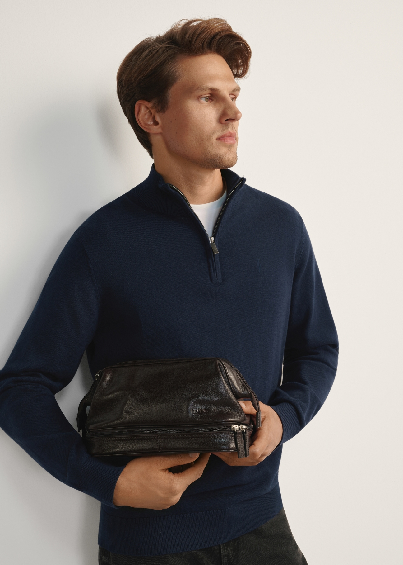 Kosmetyczka męska w brązowym kolorze wykonana ze skóry naturalnej to propozycja łącząca funkcjonalność z ponadczasową elegancją. Dzięki delikatnemu połyskowi prezentuje się niezwykle stylowo i podkreśla charakter właściciela.