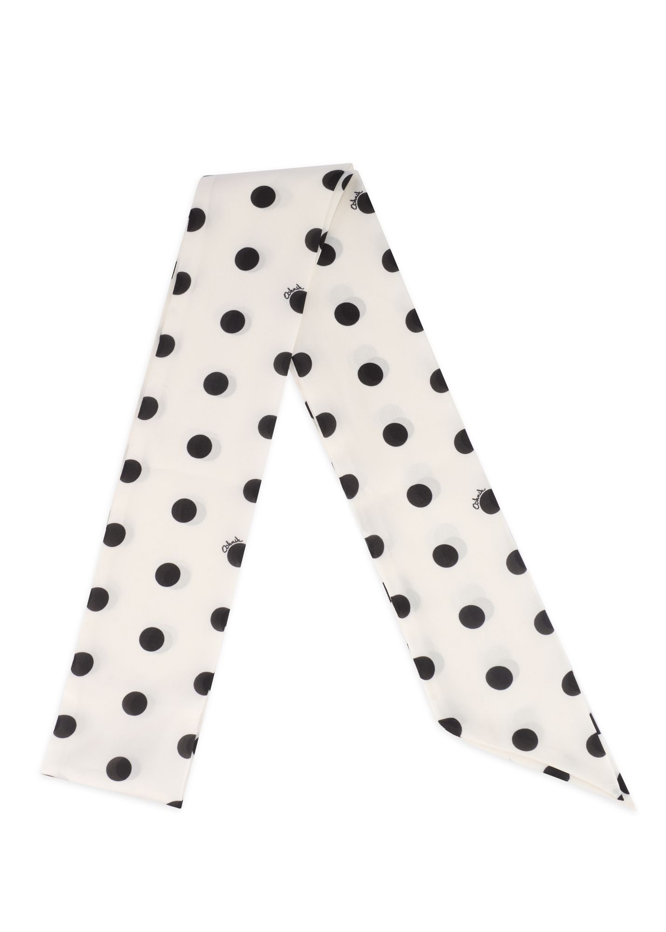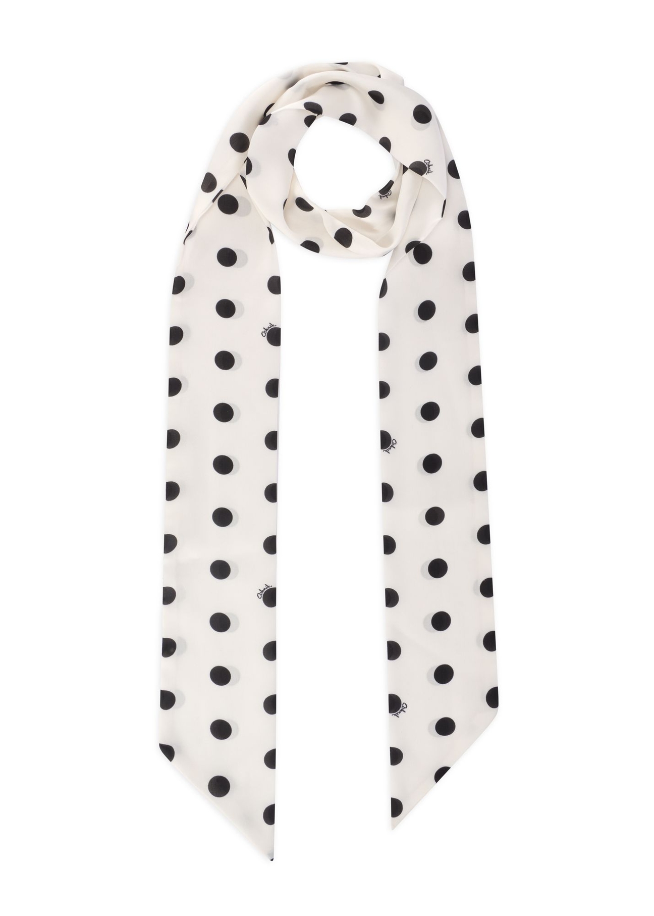 Wykonana z delikatnej tkaniny o subtelnym połysku, pięknie układa się i miękko otula szyję. Wzór w duże grochy nadaje jej modnego, retro charakteru.