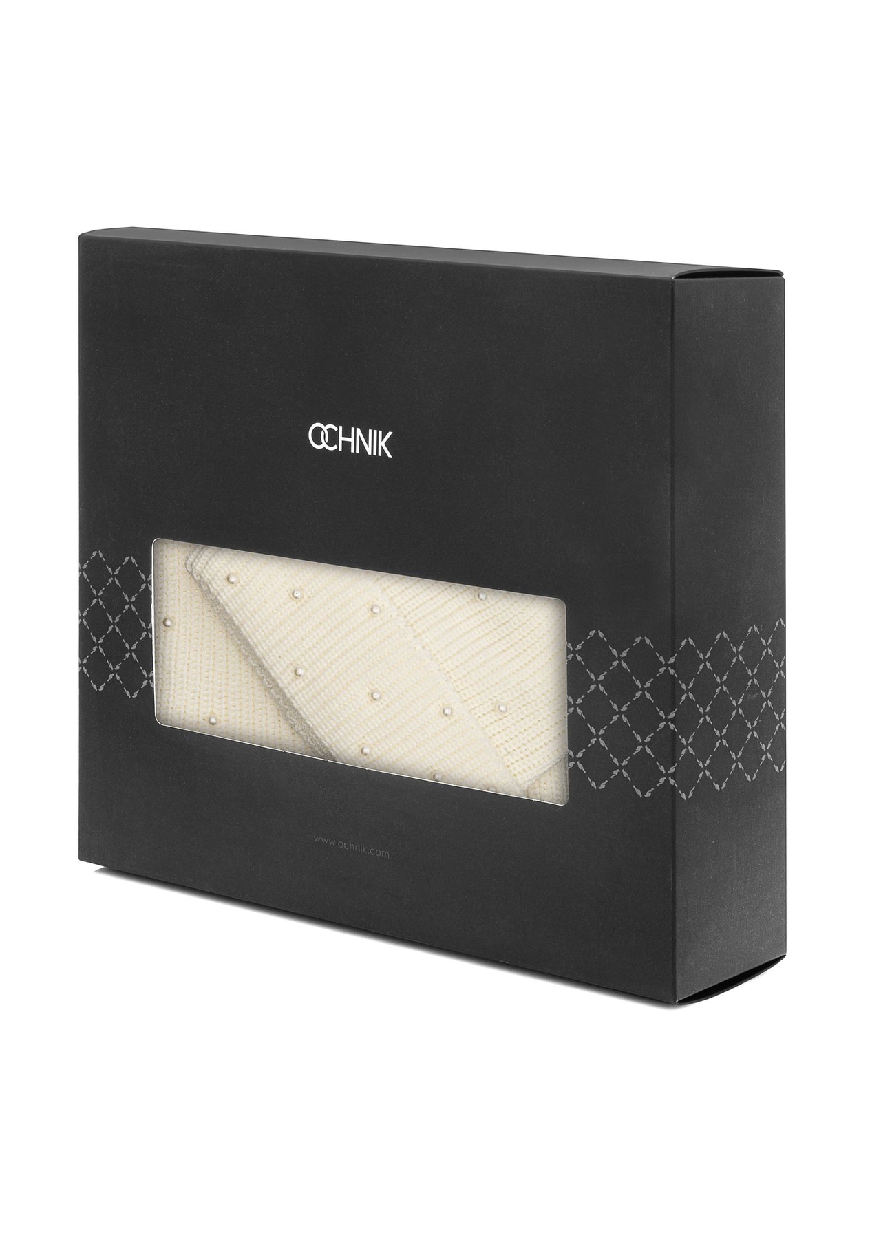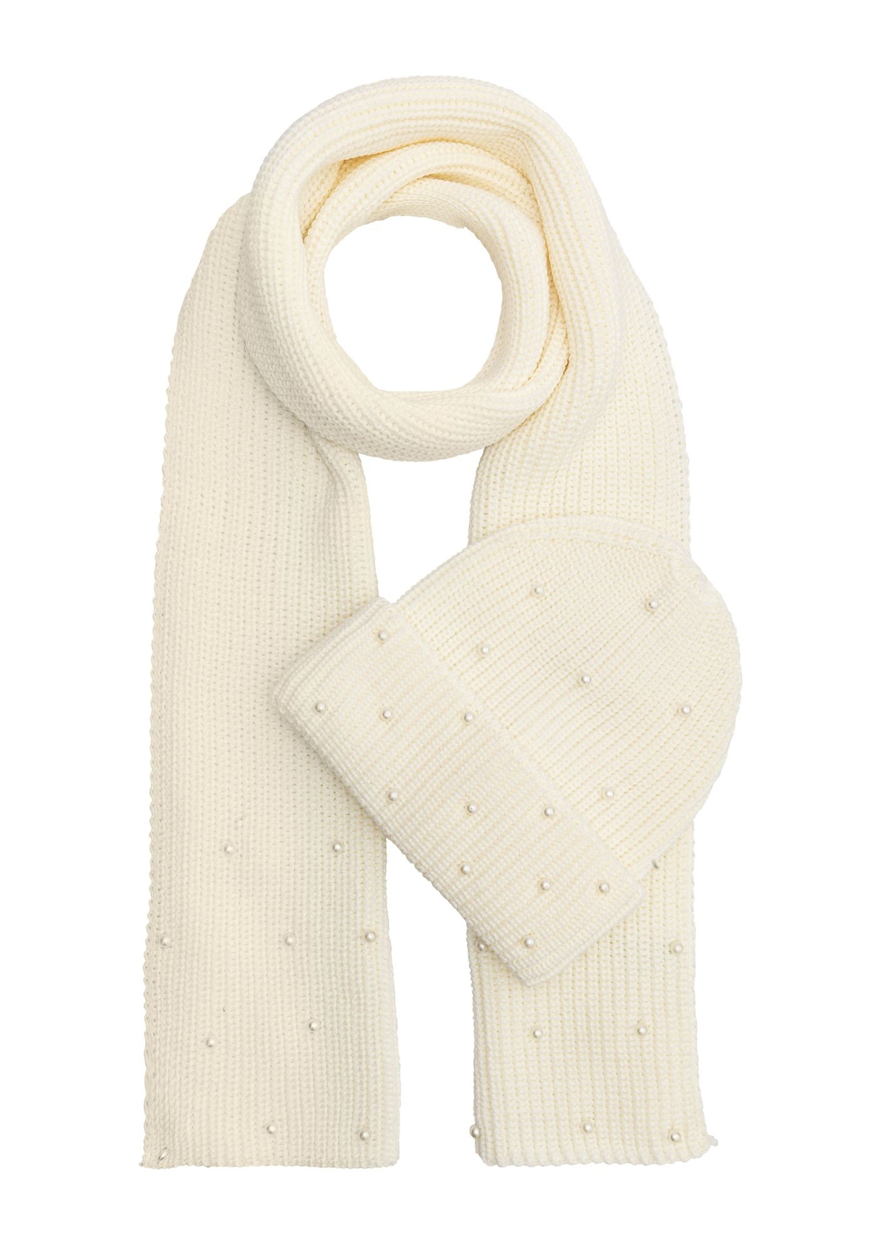 Ozdobne perełki nadają całości delikatnego, kobiecego charakteru i sprawiają, że zestaw wyróżnia się wśród klasycznych zimowych dodatków.