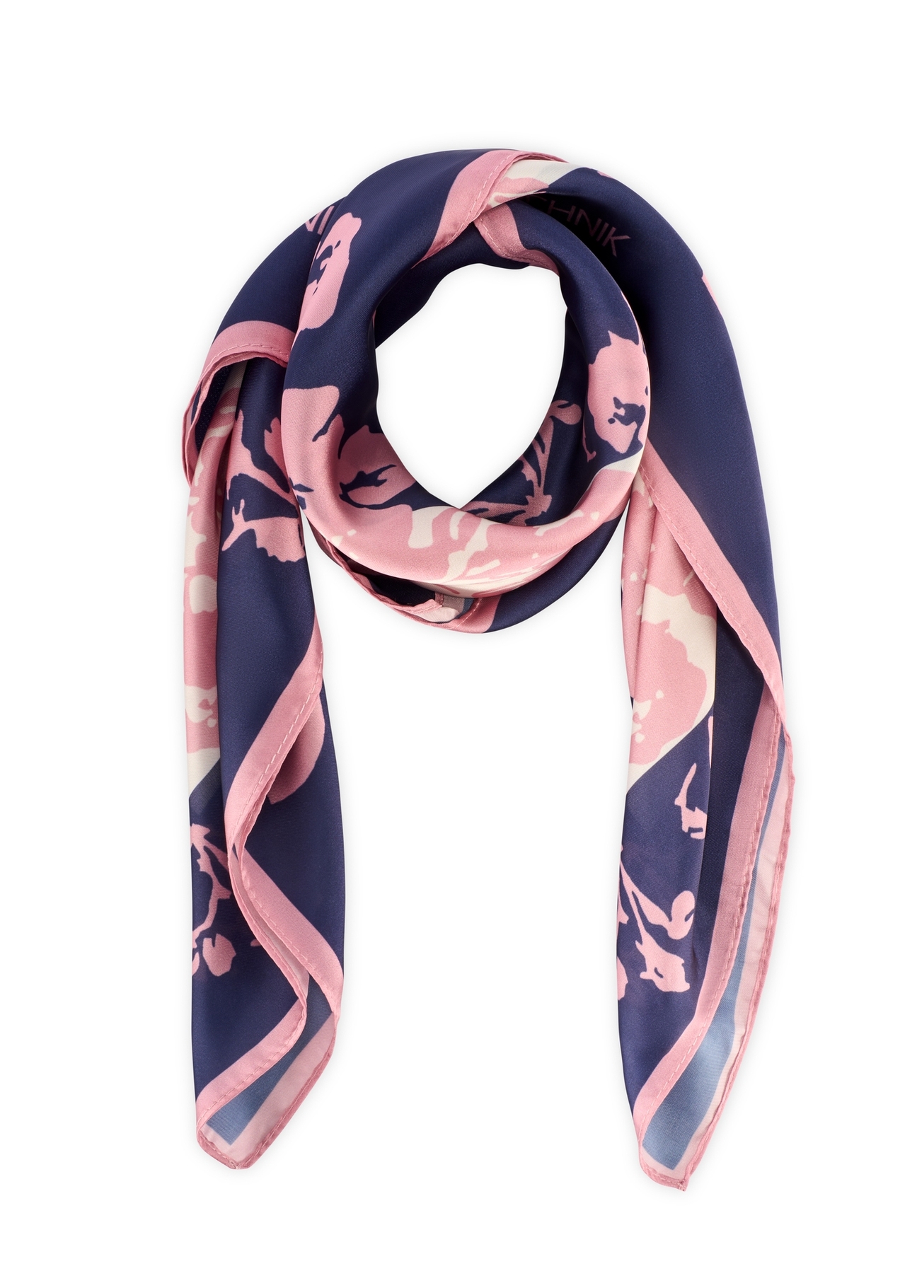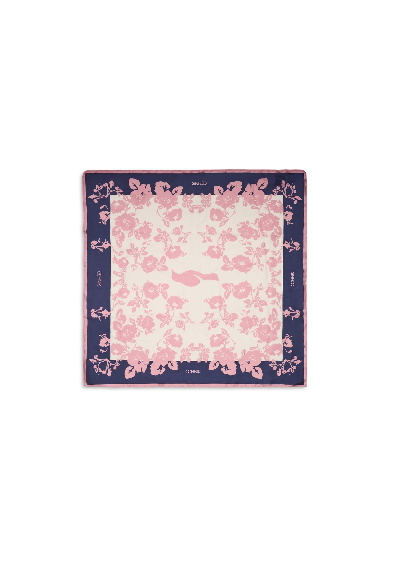 miękkiego, cienkiego materiału. Różowa baza stanowi doskonałe tło dla kremowych, kwiatowych wzorów. Szalik można elegancko owinąć wokół szyi lub bardziej nonszalancko zarzucić na ramiona.