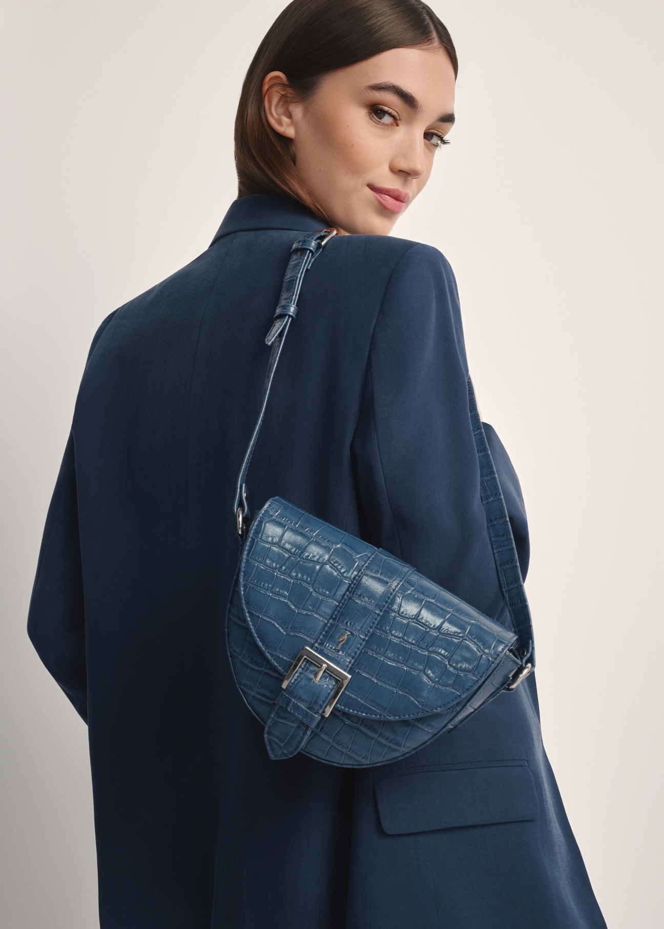 Модель з однією основною секцією та внутрішньою відкритою кишенею дозволяє легко організувати речі. Застібка на металевий гачок та сріблясті елементи оздоблення підкреслюють елегантний характер сумки. Регульований, незнімний ремінь дозволяє носити сумку на плечі або через плече, а делікатний емблем у вигляді жайворонка додає їй унікальності.