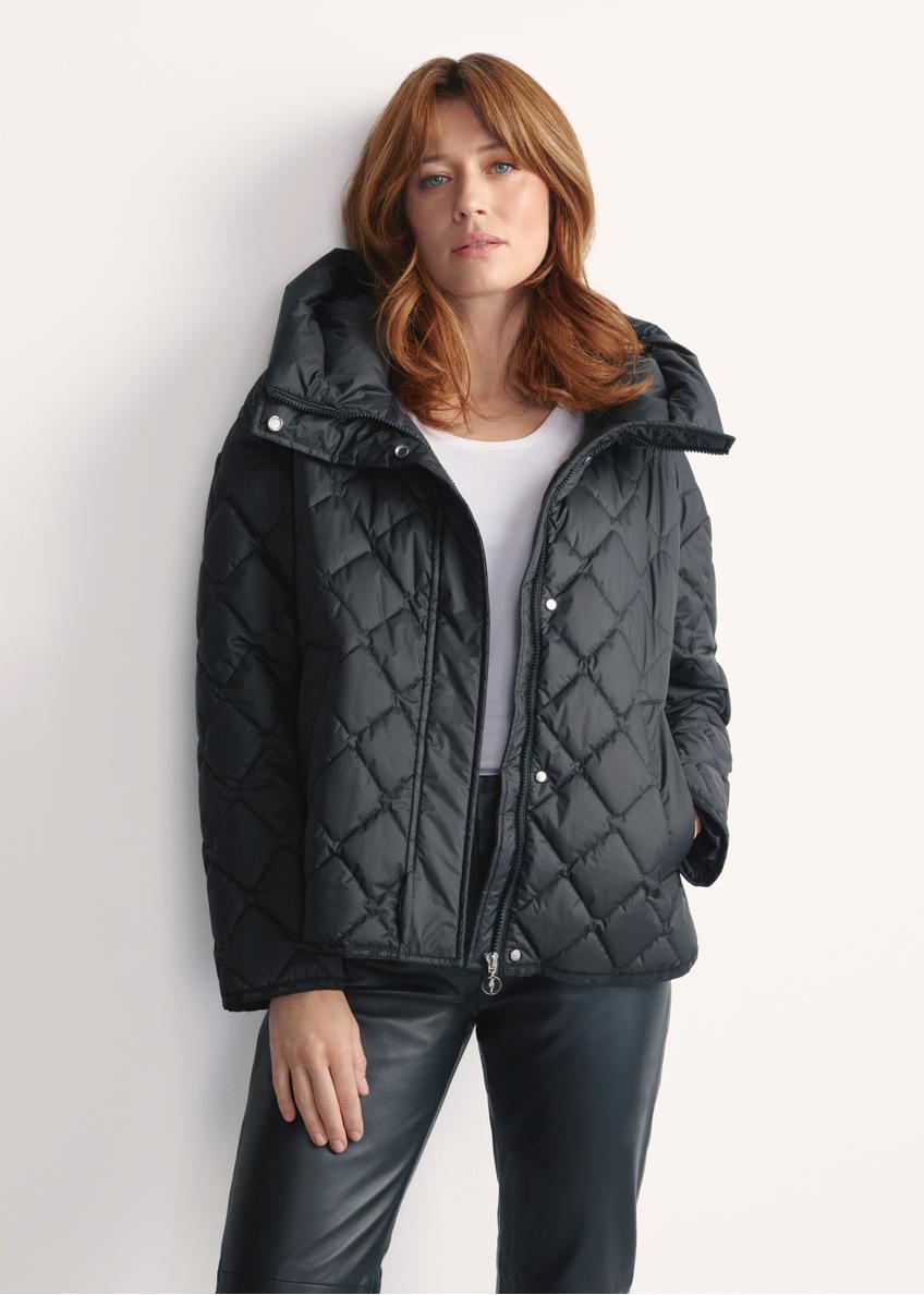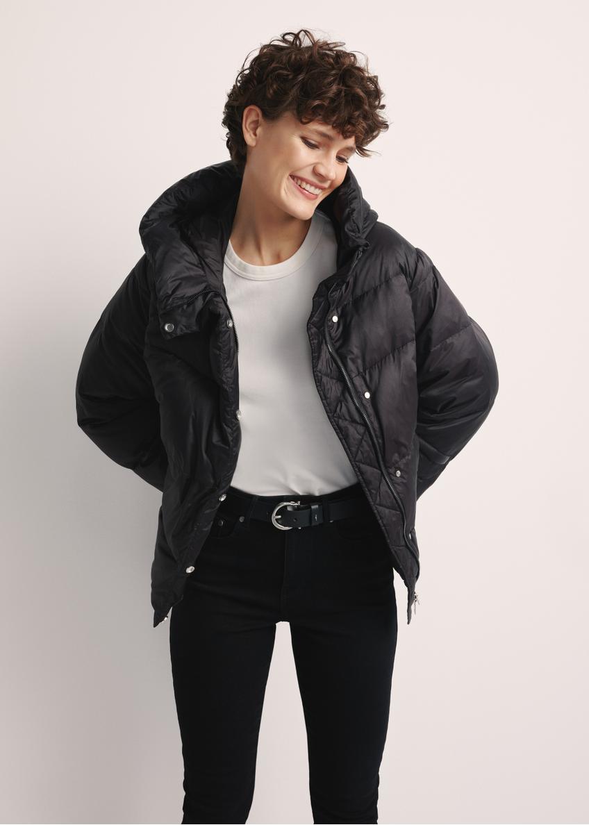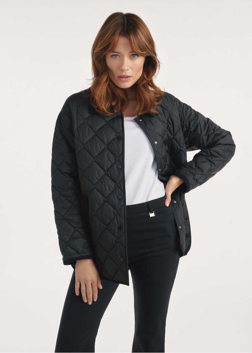 Чорна жіноча стьобана куртка KURDT-0599-99(Z25), вигляд виробу на моделі. Видно половину силуету.Чорна стьобана жіноча куртка KURDT-0599-99(Z25)