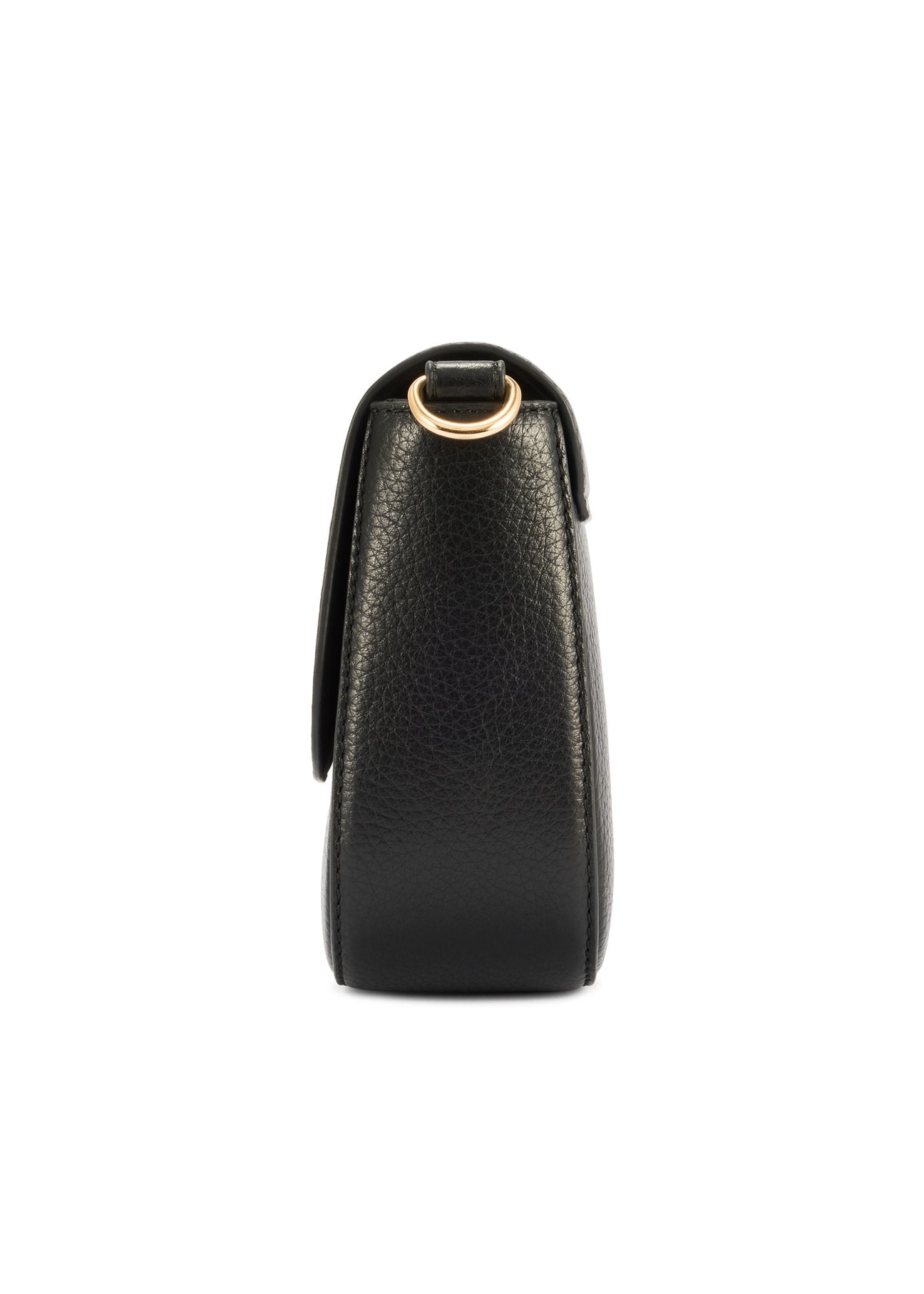 Чорна жіноча сумка через плече – це елегантна та позачасова модель, виконана з натуральної, зернистої шкіри, яка відзначається міцністю та тонкою текстурою.