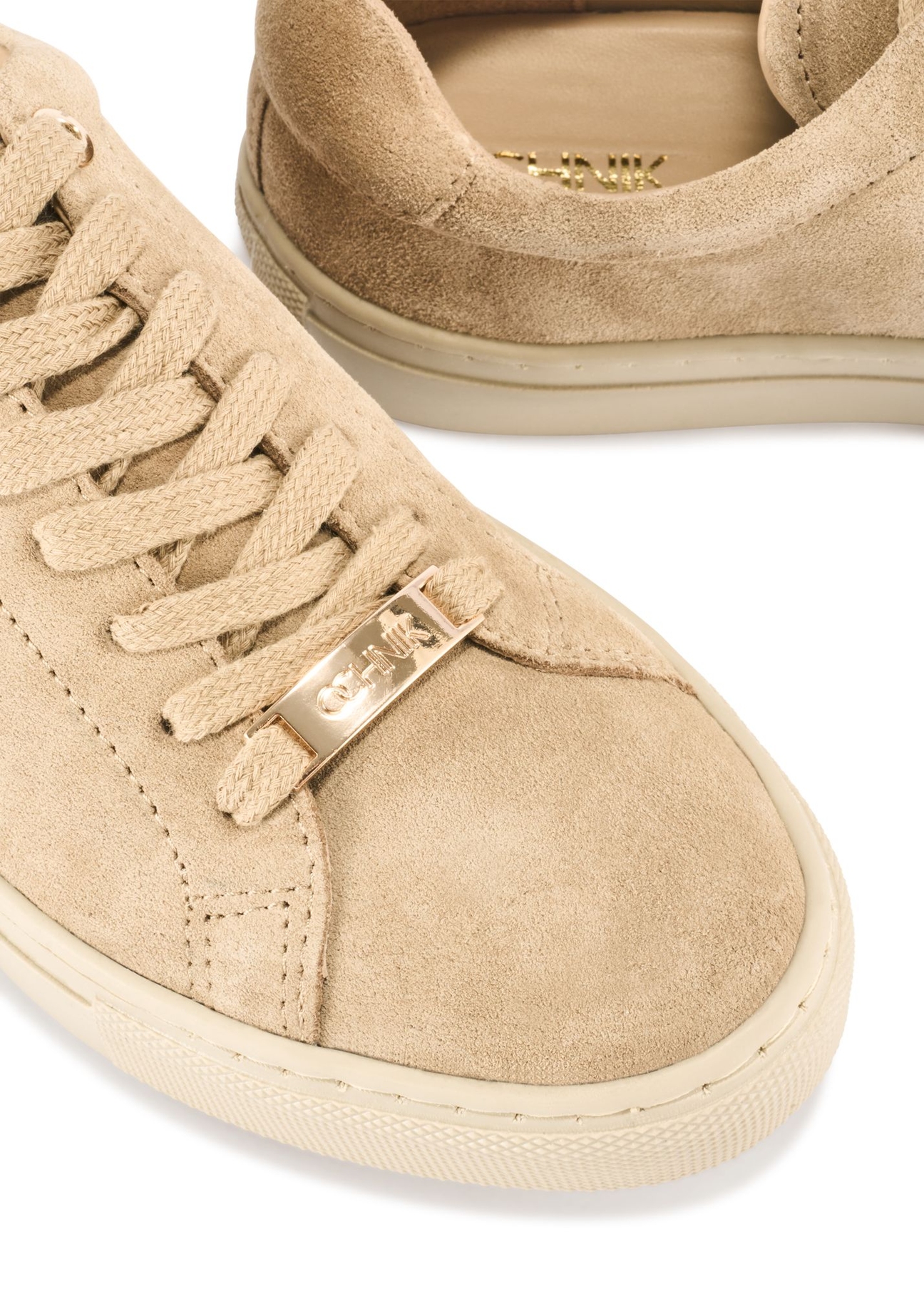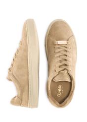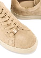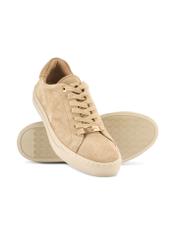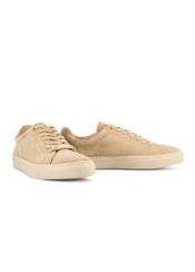 Спортивне взуття виготовлене з високоякісної телячої замші темно-бежевого відтінку, яке вражає своєю витонченістю і універсальністю. Стильний, шнурований фасон із закругленим носком підходить як для кежуал образів, так і для більш продуманих комплектів.